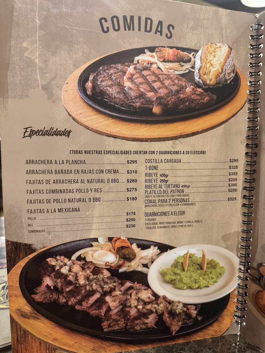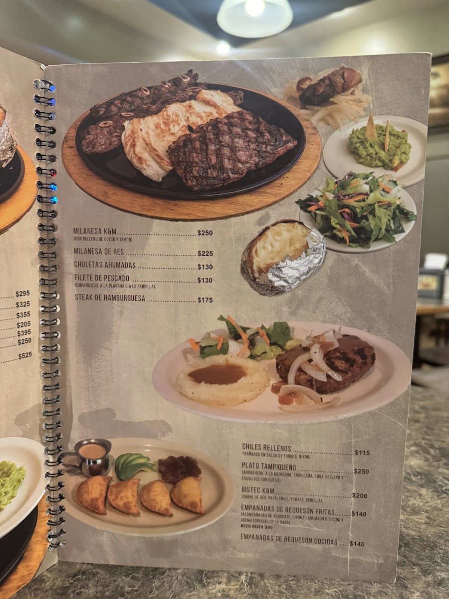 Meat dishes are well represented with options like rib eye steak and various parrilladas (grilled meats), as well as dishes based on chicken. The menu also includes popular Mexican staples such as quesadillas, enchiladas rojas, and tacos.